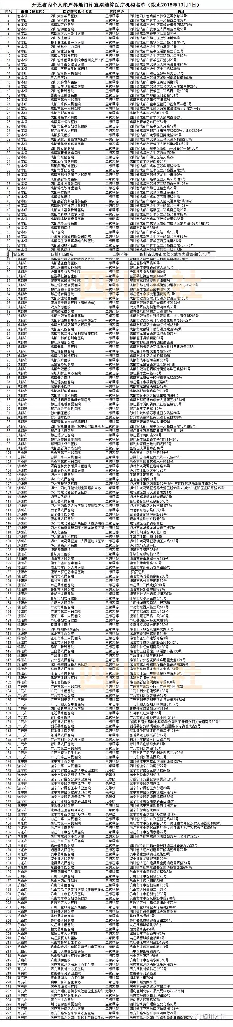 目前全省共开通省内个人账户异地直接结算医院464家、药店1073家(名单附后),开通医药机构信息可通过四川省人力资源和社会保障厅官网(www.sc.hrss.gov.cn)查询。